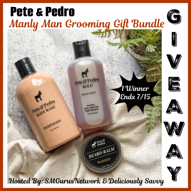 1 Lucky Winner Will Win a Bundle of Pete & Pedro Grooming Essentials for your Manly Man ~ 1 Winner Will win Peet & Pedro’s DESPERADO Body Wash, BOLD Bourbon Shampoo and RUGGED Beard Balm! (TRV $57!)
